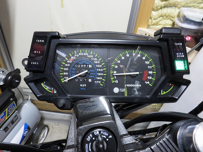 ガソリンを入れる。 ![]() キャブの同期を取った残りのガソリンをタンクに入れます。 ![]() 5リットル購入して、2回エンジンをかけているので、 4.5リットルくらい残っている。 ![]() エンジンをかけてメーターを撮ったけれど、 燃料警告灯が点かないし、 ゲージも動いてません。 残念。 この後いっぺん外してテスターで警告灯の抵抗を測ったのですが、∞でした。 ハーネスの出口からコネクター感はちゃんと0Ω もしかしたら警告灯センサーがだめになっているかも? |