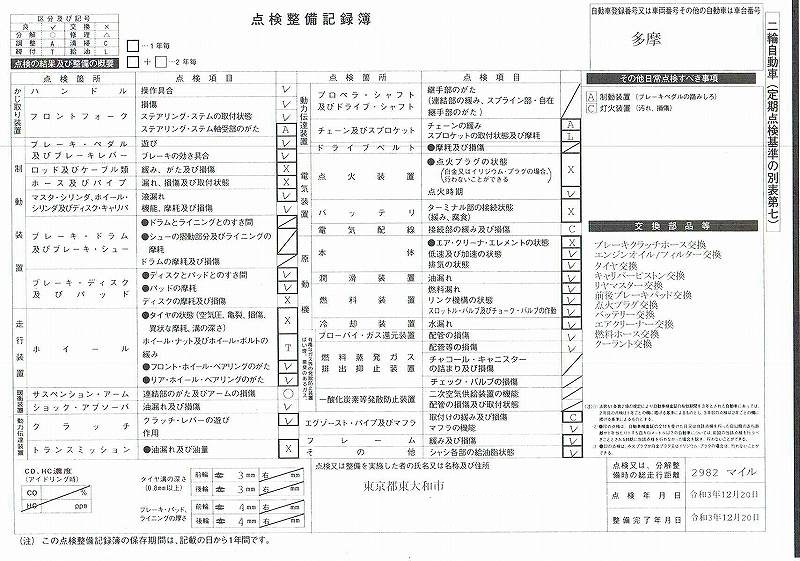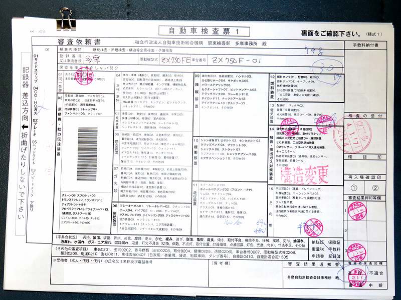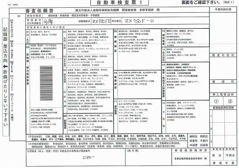 多摩検査場へ行く日を考えていたのですが、 光軸検査に行く前にとりあえず7日の 午後からの第3セットを予約入れておきました。 11日予約を削除して取り直し。 今日は暖かい。 多摩を予約したつもりが品川へ予約を入れていたらしく、 多摩車検場で手書きで予約表を書いてしまいました。 すいていたので問題なかったですけれど。 ![]() 車検場の動線です。(青はバイクを止めたところ) 前日までに重量税や、検査証書、自賠責は済んでいて、かつ書類を書いてあるうえでの動きです。 1ループ目は継続検査と同じ項目。 総合判定窓口で合格なら6番へ行って継続車検なら車検終了です。 今回はわずかな改造ながらもう一回ループしなければなりません。 0番レーンまでぐるっと回ります。 前車軸重量と全重量、車幅、 関係ない車長と車高も計測されています。 0番の出口前左側にバイクを置いて、判定書類を書いてもらうまでの待合室がありました。 出来上がった書類をもって、再度総合判定室へ行き最終合格のハンコをもらい、 継続とは違う1番窓口へ書類を提出すると車検シールがもらえました。 せっかくなのでここで仮ナンバーを外して一般車両に戻し。 家へ帰って、市役所へは車で行って、仮ナンバーと許可証を返納して 一連の作業終了です。 ----------------------------------------------------- 6番窓口で受け付けてもらって、順番をそろえてもらった写真 ![]() 1.検査票 ![]() 2.自動車税 3.自賠責 ![]() 4. 2号様式記載表 ![]() 5.旧車検証 ![]() 6.点検整備記録簿 ![]() 7.手数料納付書 ![]() 8.重量税納付書 |