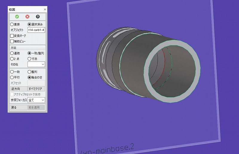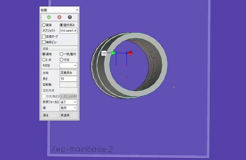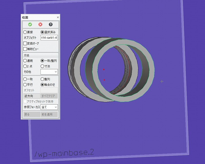 削り始めを変える為、wpを移動します。 どこまで移動するか測定して決めます。 で、円筒の上下長さを測定。 距離で面から面まで(稜線・面でも稜線・稜線でも) 2要素を触ると測定できます。 ![]() 距離が15mmとなりました。 じゃあ5mm移動しますか。 wpを左クリックで選択して、さらに、wp位置決めを選択。 出てきた矢印をドラッグ5mmに合わせるか、数値を入れる。 選択しただけだと、パーツを作り始めてしまうのでちゃんと位置決めアイコンを選ぶ。 ![]() 中ボタンで作業終了。 今度はwpを選択し、引っ張るだけ。 ここで緑色のパーツが出てくるときは 新しくパーツができてしまう=加工したいパーツがアクティブパーツになっていない。 構造一覧からパーツをダブルクリックすると、 パーツがハイライトするので、右ボタンで出てきたメニューからアクティブ化を選択。 緑のアンダーバーと太文字表示になるのでわかるはず。 表示のチェックボタンをオンオフして、部品を探すのも手。 見えている部品をパーツとして選択できれば一番簡単。 稜線が集まる角があれば簡単。 パーツ選択簡単にできる方法があった気がするのだが、、、 ![]() 見ているパーツがアクティブパーツなら、 ちゃんと削ってもらえる。 その時は紫色。 5mm引っ張って 中ボタンで確定。 へこんだ面はそれぞれいじれる。 底面は半径で変更。 ![]() 画像左右の短手の立壁は 面が中心を向くように作ったから 面を移動すると、角度で移動可能。 上下面は上下。 コーナーの稜線を選択すると ブレンドRを ![]() 消すときはブレンドを選択して、 消しゴムアイコンで削除。 たまにRがついた2dで面を削ったりすると ブレンドの認識がなくなってることがあった。 その時は定義でブレンドを指定できる。(やり方は忘れた。) 2dで半円を作って先端が半球の棒を作ると、 定義ができなかった気がする。 2dで形を作るよりはパーツにしてから削る方が楽と思われ。 空間とか、稜線をセレクトした後とか、 面をセレクトしたときとか、 パーツをセレクトしたときとかで 右ボタンを押した時のポップアップ表示が違います。 やれることが違うからそれだけでも便利。 さらに、表示内容を追加や削除もできる。 いちいち画面上端部に並んだメニューから選択しないでも 次の動作を選べる。 私はめちゃ追加して使っていたので、 他の人のPCを使えなくなってたりした。 ![]() カスタマイズで右の表が出る。 最初のタブの位置はコマンドだけれど、 メニューにして、右のプルダウンメニューから今回は初期選択パーツを選んだ時に 使うメニューを追加してみる。 ビューポート右クリックを選んで、 出てきた窓の上左、コマンドタブをクリックし、 グループから、パーツ&アッセンブリを選ぶと コマンドが右にずらっと並ぶ。 上から3番目-8番目までを順番にドラッグして、 同時に出てきた左のポップアップメニューへドロップする。 ”した”のが上のキャプチャー画像 4行目から6行追加してます。 上端メニューにないものも追加できるので、慣れると便利でした。 左のメニューに和、差、の後に切断が入っているのがわかるはず。 この”切断”でページ最初のキャプチャー画像の部品の3分割をしていました。 切断する、にしてもwpには閉じた画像が必要。 左の構造一覧vportから移動したいパーツをWクリック 稜線とかがオレンジになったのが選ばれたパーツ。 この状態で、右クリックメニュー、から、位置を選ぶ。 オブジェクトはWクリックしたパーツが入っている。 ![]() カスタムで”初期選択パーツ”を選ばないで、 画面上で”右クリック”を選択して、 パーツ&アッセンブリから移動を ドラッグ&ドロップして登録しておけば、 右クリックだけで位置のダイアログボックスを出せる。 この時はオブジェクトがからなので、wpも拾ってしまうところが違う。 ここではずれた円筒を中心線上に合してみます。 違う部品同士のセンターを一本軸にしたいときですね。 一致整列ボタンを押すと、メニューが追加して出てくる。 ここで軸合わせを押す。 ![]() キャプチャー画像にはありませんが、 クレオダイレクトモデリングの左下、に 文字が出てくるはず。 ”最初の要素をクリックしてください” 軸が書かれていなくても円筒はあるわけで、動かしたい部品の 円筒面をセレクトのため左クリック。 ”次の要素を、、、”と言われたら、動かさない固定側の円筒をセレクト(左クリック) 実際は偏心量を減らすだけなのでこの方法じゃない。 左上メニューの上の”一操作戻し矢印”を押して偏心している状態へ復帰。 じゃあ実際難ミリずらしたのか?わからんのです。 軸が合えばいいだけなので。 他のパーツを作っていたりしたら、それに合わせこむ必要は出てくるけれど、 基本寸法はわかっていて、軸合わせるるもんだから、 測定しようとすると、面倒くさくなる。 (ねじを穴に入れるときなんかは便利) ------------------------------------------ 1.新規wpを面に平行に作って、2.円稜線を(偏