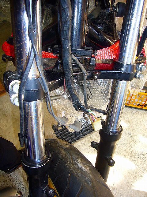 メインハーネスがタンク下でコネクター分岐して、ハンドル左右のSWに分岐。 コネクターを位置決めしている樹脂ホルダーも汚かったので外してしまいました。 |