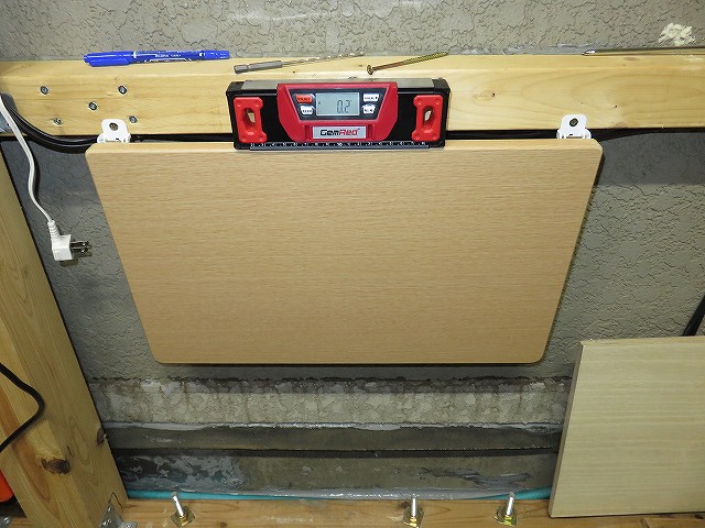 小屋を建てる時に使った、デジタル水平儀で取り付けねじの水平だし。 付属のねじだと60mmのホワイトウッドで受け止めることになるので、下穴をあけて、100mmのコーススレッドで固 定。 下側の固定部分がこのままだと60mm空いてしまっているので、 |