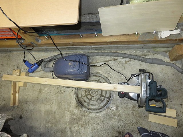 カインツホームで購入してきたホワイトウッドを適当に短くして。 ケーブルをよけて設置し、下穴、コーススレッド打ち |