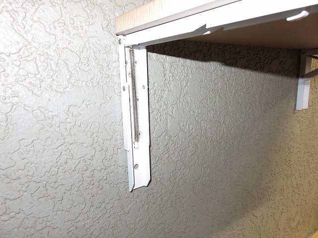 余った折り畳みテーブルは部品棚にします。 こっちは付属のねじで取り付け。 壁は20mm厚の木質コンクリートで貼ってあるのでどこでも大丈夫。 斜めの支えはテーブル下の切り欠きに引っかかっているだけなので、片方外すと、ねじ止めが簡単にできます。ねじ位置には 穴も開いていて増し締めも可能。 |