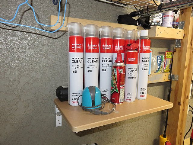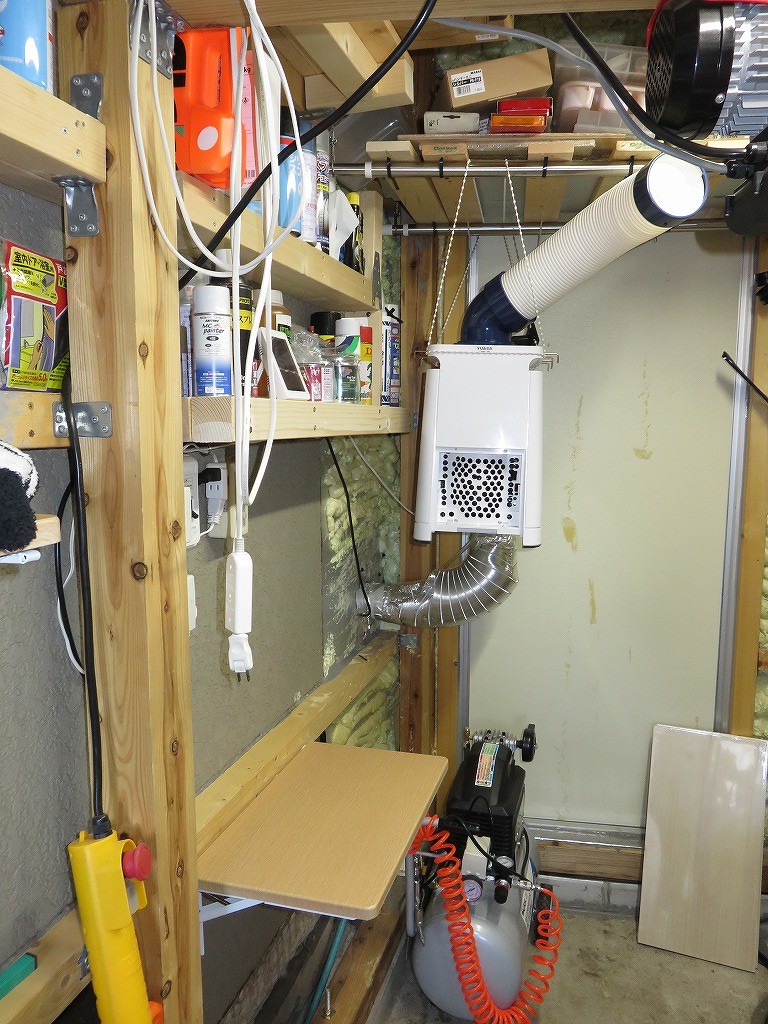 コーススレッドの頭径がちょっと大きいので完全にはテーブルを閉じることができませんでした。 余ったホワイトウッドは壁のスプレー棚の幅を広げるため、打ち増ししています。 下段が60mmX3段直列打ちした部分。 本当は取り付けた右側へ同じようにつけたかったのですが、ガルバリウム鋼板を張っているところに見えるホワイトウッドを 止めている5本のコーススレッドから右側は壁がありません。 ちょっと幅が足りない。 テーブル下にはエアコンプレッサーを置くことができます。 |