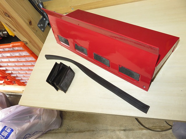 もう一つ マグネットパーツトレー(\799)在庫限り マグネットが裏に4個コーティングされて、接着してある。 これも直止めしたいので、 マグネットを外す。 下面のゴムをはがす。 への字の部分を金づちでたたいて平面に。 穴あけ面の下面にうっすらと平面直しをした線が見えてます。 固定穴をハンドパンチでφ5穴あけ6か所。 下穴があったほうがいいと感じたので、φ2.5mmで下穴をあけて、取り付け。 |