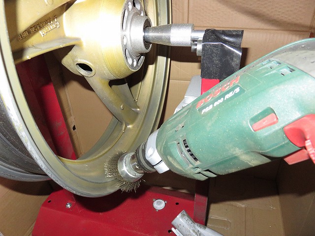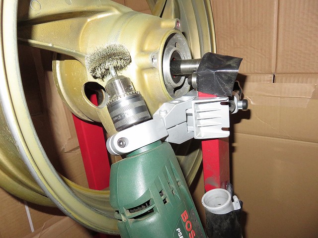 ベアリングを抜かないで今回は塗装しちゃいますから、 ドボンと水洗いができない。 ちまちまワイヤーブラシでこするのが嫌だったので、 ドリルに回転真鍮ワイヤーブラシをつけて肉体疲労を軽減しようと。 家の中でブラシを使うために作った段ボールハウス(窓付きwww) ![]() 隙間からホコリが飛び出ないことを目的にして掃除機で中の空気を引っ張ってます。 付属のシャフトは使用せず。 リヤアクスルシャフトを利用するために柱の位置を左右とも内側へ移動してます。 柱にドリル固定金具を取り付け削りスタート!! ![]() だったのですが、下から上へ持ち上げることになるので、 軸は布テープで固定、シャフト自体にもホイールが左右へ動かないように、 ビニールテープを巻く必要が。 リムは内側外側ともカッターナイフを利用し塗装をはがしてます。 ![]() ブラシだけだとえらい時間がかかるし、リムはきれいにしたかったんですよ。 元からのガンメタ塗装まではがしちゃってます。 塗装かす。 ![]() なかなか塗装が剥げていきません。 うまくブラシをあてることで、ホイールは勝手に回転しながら削れて行きます。 ![]() 下地が出てきてますよね。 ![]() 仕事している風になってますが、いや時間がかかる。 ![]() 途中経過。 ![]() ![]() |