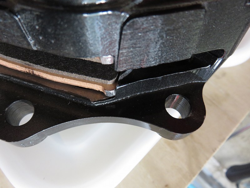 組んであるキャリパーを3個つけるだけ。 なのだけど。 まず、サポートの二つが左右どっちだったか忘れている。 ![]() キャリパーサポートは塗装済み キャリパーへM10でねじ止め サポートは1000番のアルミで非常に柔い。 以前締めすぎて山が半分バカになっている。 ![]() ボルトはM10ボルト 出っ張るとディスクに当たる。 っと、ブレーキパッドの両端が出っ張っていてサポートに当たることを発見。 ![]() 今までは当たっていなかったと思ったのに?? 仕方ないのでグラインダーで角を落とす。 ![]() ボルトはバンジョーボルトを流用 座面が広いので使い勝手がいい。 ![]() 穴あきー ![]() 本締めは車体につけてから。 |